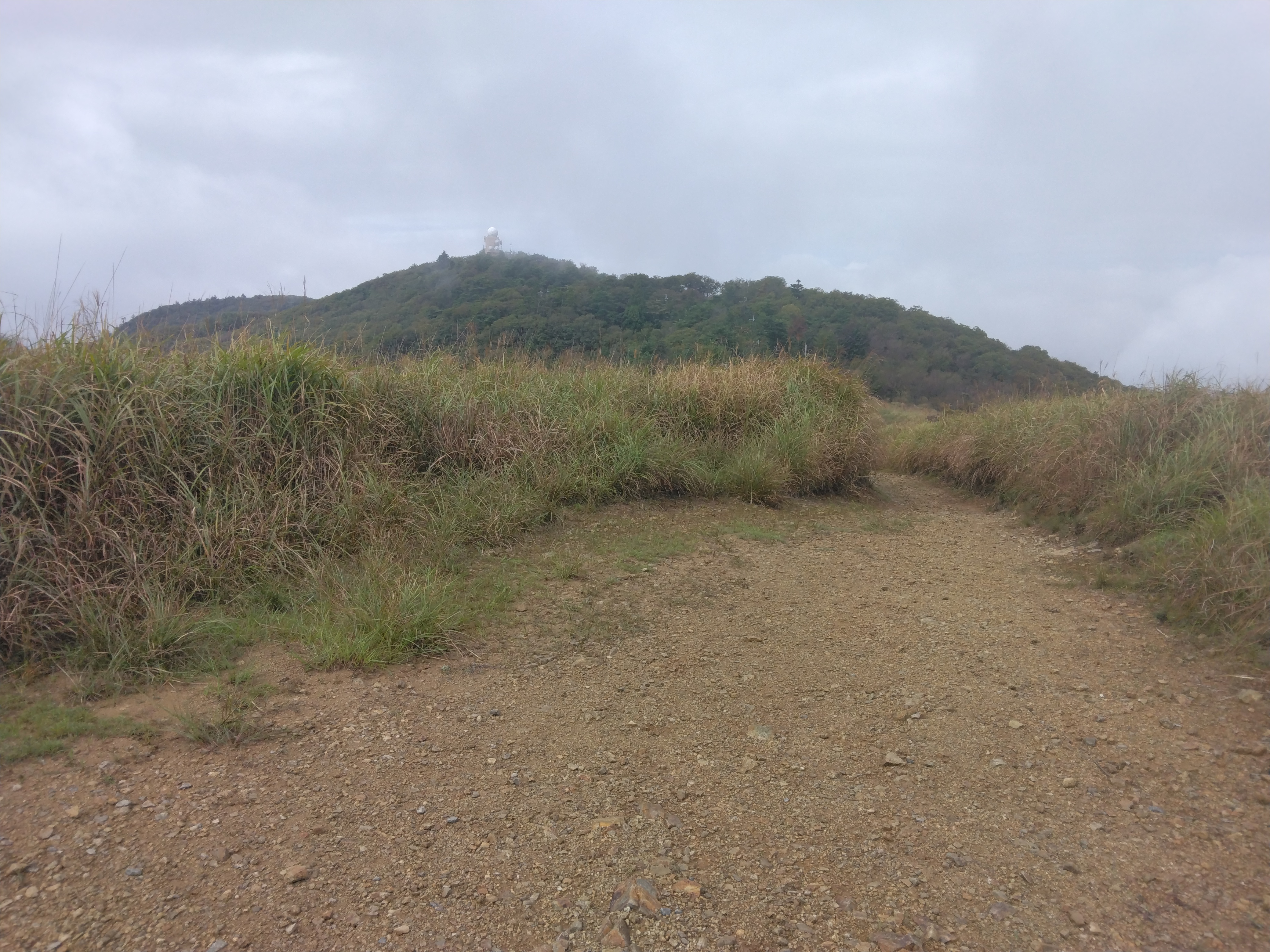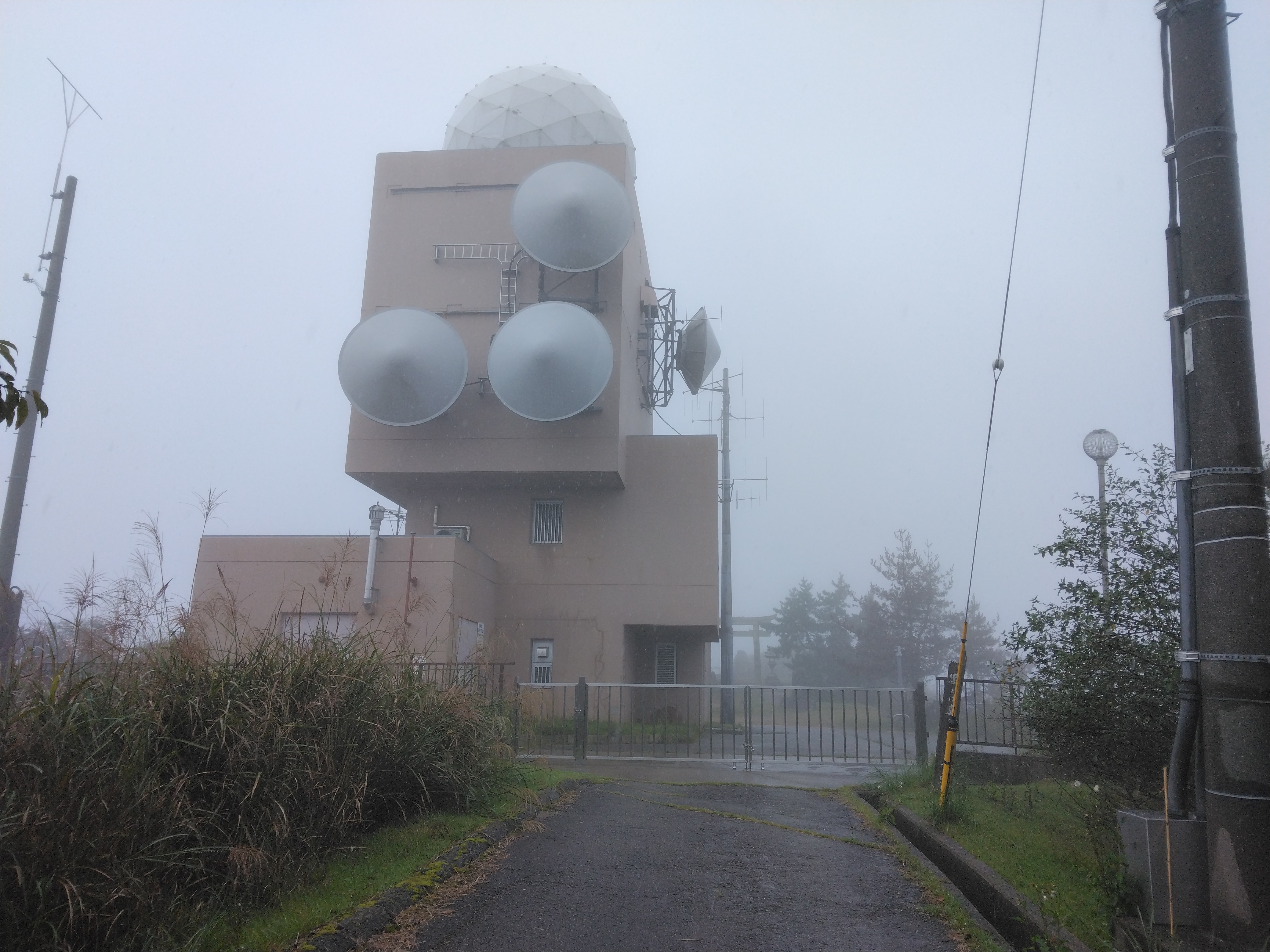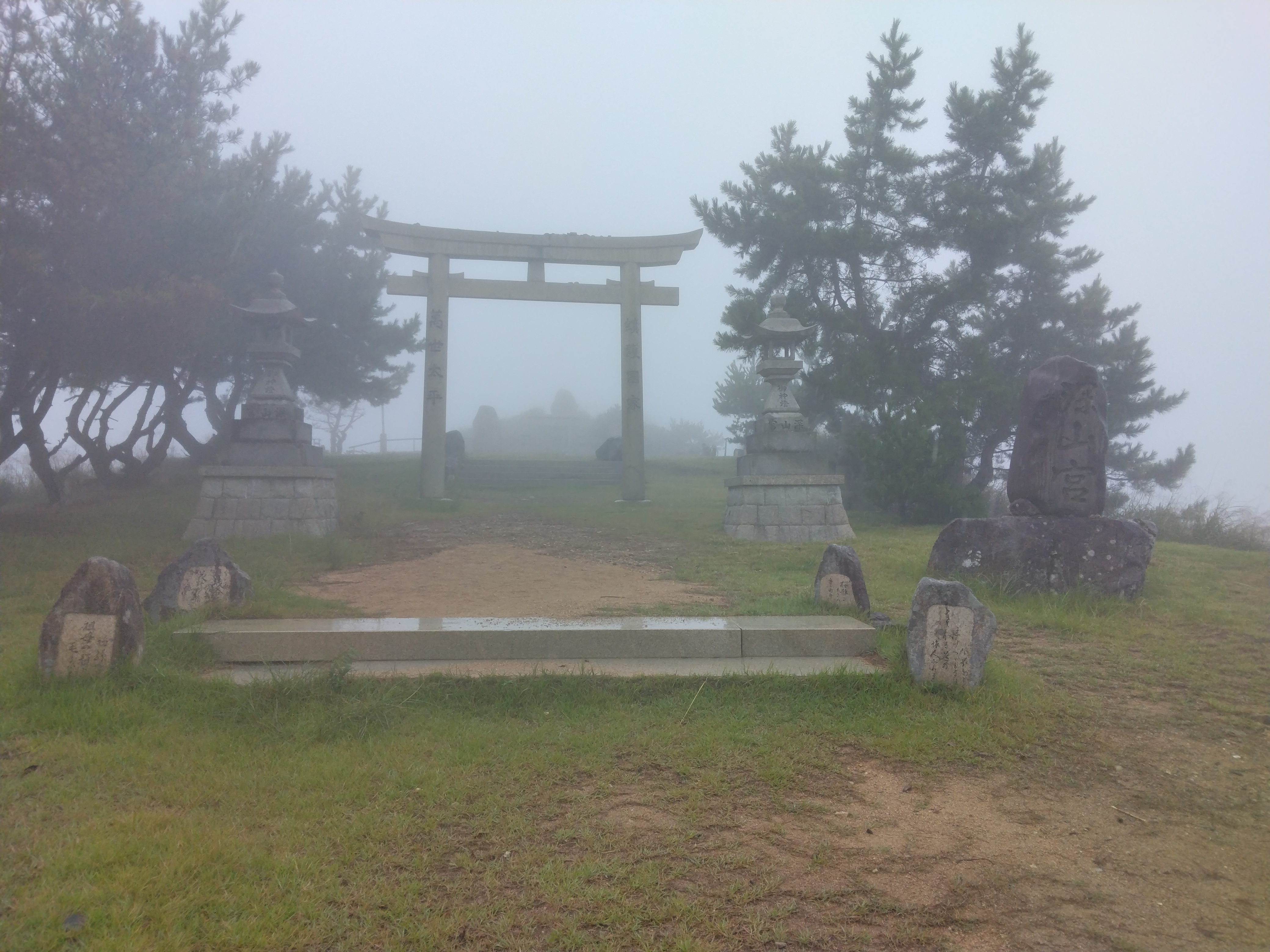 女房殿と別れ、自動車道を登山口まで歩く。ゴルフ場の横をしばらく登って行く。深山への案内板が実に頻繁に出てくるので迷いようがない。P641bを過ぎ、天王への分岐あたりから雨が降りはじめる。持っていたペラペラのビニール製のコートを着て、ザックにもカバーを掛ける。ススキが道にかぶさっているところが何度も出てくる。道を見つけるのは難しくないが、ズボンやコートが大げさに濡れるのには閉口した。道幅が広くなったススキの草原は気持ちよく歩ける。前方に雨量観測所の大きな建物が見え、山道は左手を走っていた舗装道路と合流する。ゲートを通り抜けると深山宮の鳥居と大きな岩のある小さな丘があるだけで、本殿のようなものはない。神社本庁に属さない神社だそうだ。展望はすばらしいらしく、4枚の展望図が設置してあった。描かれている山は、ごく遠方のいくつかを除けば登った山ばかりなので、どれ一つ見えないのは残念だった。雨量観測所の横で雨を避けながら昼食を摂る。