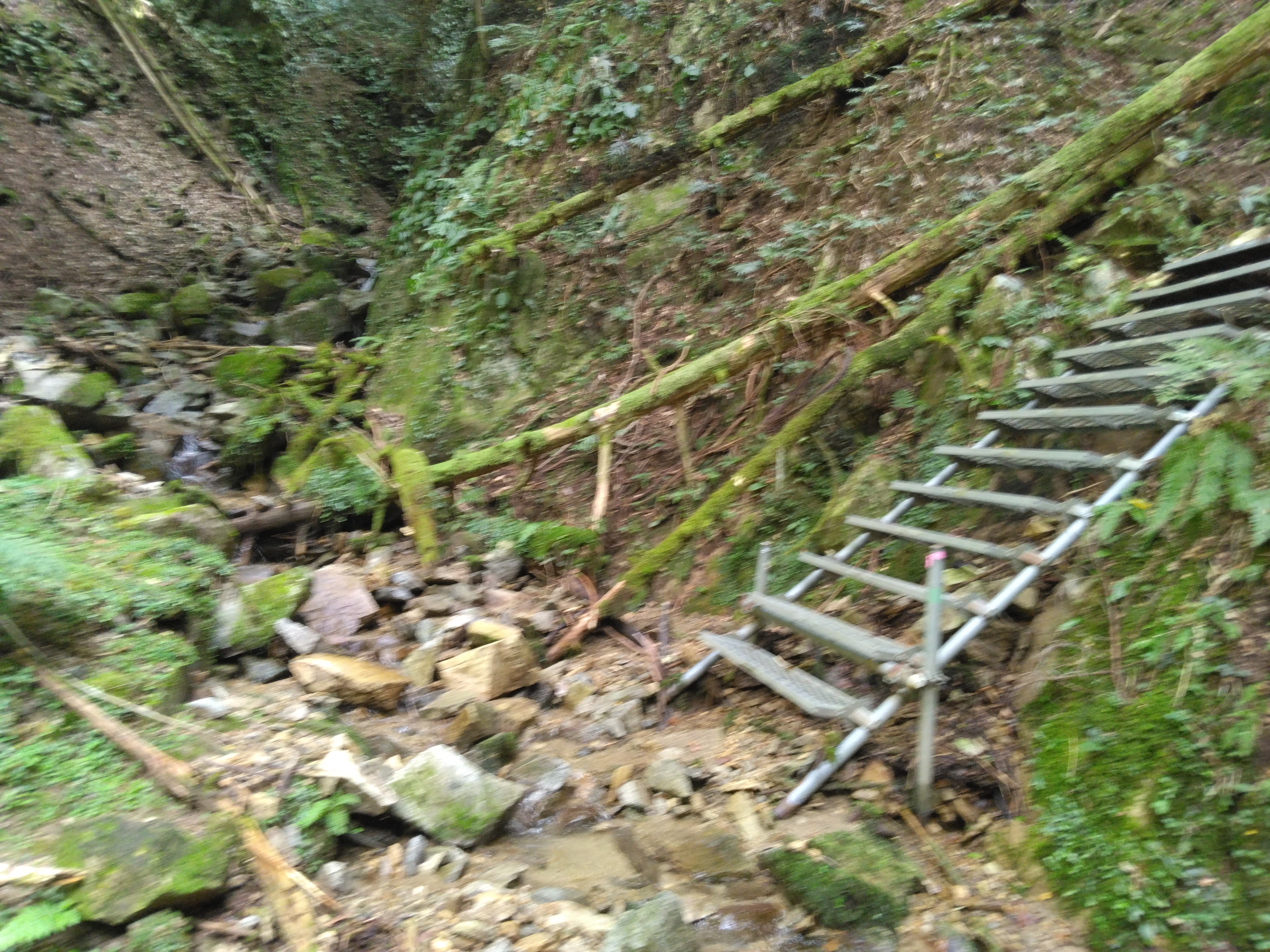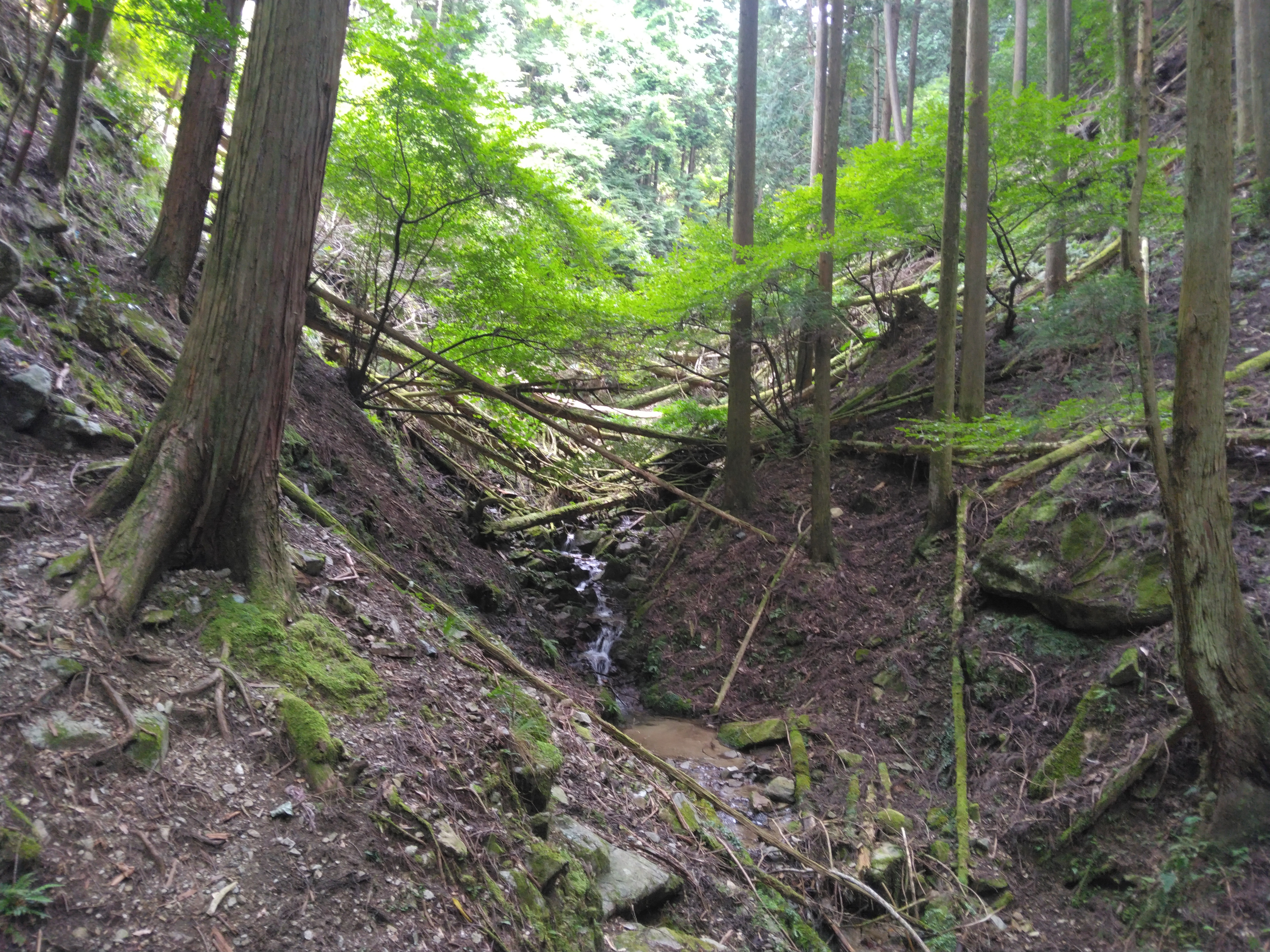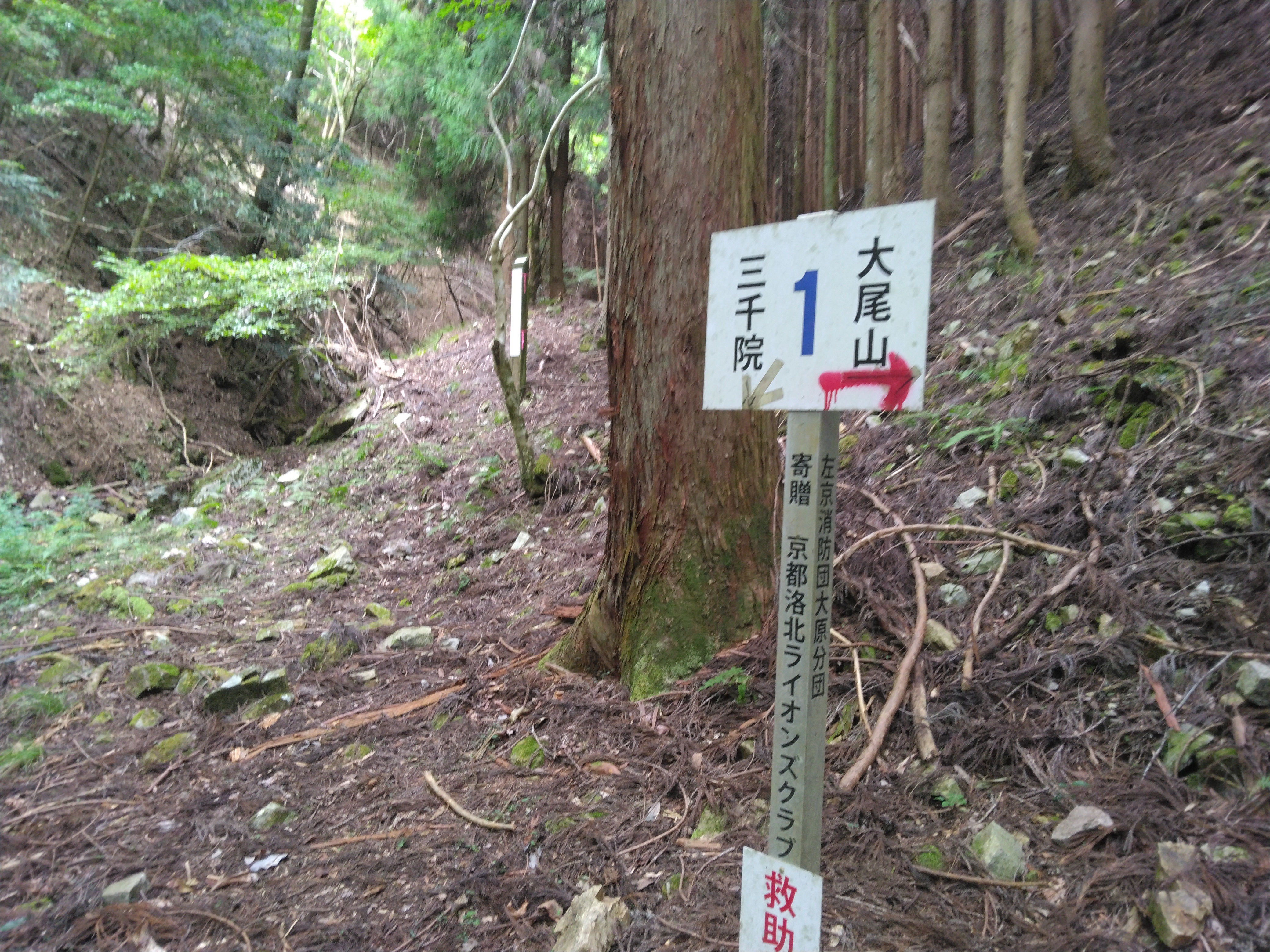 音無滝はまあまあの滝。その後、荒れた谷を遡って行く。滑滝のような風景や小さな滝があらわれ、久しぶりの沢歩きを楽しむ。トリカブトのような紫色の花が一輪だけあった。沢が二股になった所が二の滝と言うらしいが、右俣を覗いても左俣を覗いても滝らしいものは見つからない。三千院⇔大尾山という標識の所から登って行き、沢から離れ行くが、地形図の破線路に入って行くのではなく、沢に沿った高巻き道を辿っているのだった。しばらくして右下に滝が見えたが、それが二の滝だったのかもしれない。沢に戻りしばらくすると噂の倒木群があらわれる。倒れている杉の大木を越えて行くが、やがてかなり立派なバリケードが出てきた。右岸にも左岸にも逃げることができないので突入するだけ。大した距離でないのに抜けるのに10分ほどもかかった。クリンソウの葉がいくつもあり、春には楽しめるのだろうと思ったが、その代わり蛭に悩まさせるとしたら、やはり花はなくても構わない。そろそろ三の滝かと考えていたら、アルミ製のハシゴが目についた。ルートを外していないので安心して登って行く。鎖場を辿って行くと左下に三の滝が見えた。名勝三の滝という立派な木の札が地面に横たわっていた。それがなければ、名のある滝とは気が付かずに通り過ぎたかもしれない細い流れだった。滝が細くても、沢の水量が多くて歩くのに苦労するよりはよい。すぐあとで、京都大原里づくり協会の立て札のある所で昼食休憩とする。きれいな水があるし、雲行きもやや怪しくなってきたので、雨などが降らないうちにと考えた。休んだのは正解で、思いもかけず、スマホの電池が切れかけていた。最近よく事故を起こしているモバイルバッテリーで充電しておく。国産品は大丈夫らしい。